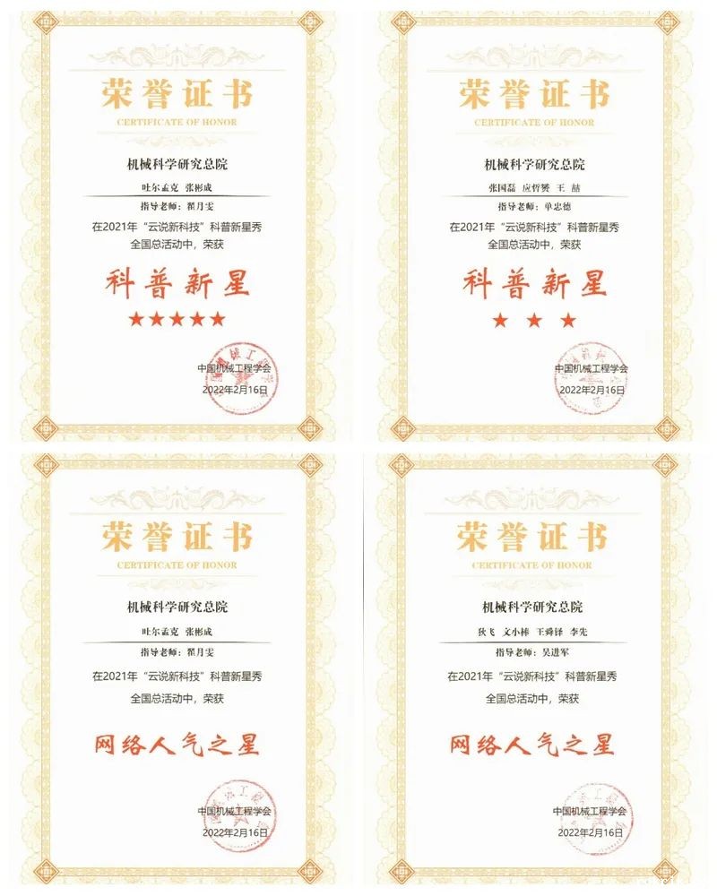 由中国机械工程学会主办,武汉理工大学、湖北省机械工程学会承办的2021年“云说新科技”科普新星秀落下帷幕。中国机械总院作为协办单位,通过前期选拔,报送全国总活动参赛作品6项,经过评审委员会审议、社会公众网络投票,我院机电所参赛作品《大载荷无模辗压成型设备》(创作团队:吐尔孟克、张彬成;指导教师:翟月雯)从86个作品中突出重围,取得第一名的好成绩,获得“科普之星”(五星)、“网络人气之星”称号;我院轻量化院和中机认检联队参赛作品《无模铸造》(创作团队:张国磊、应哲赟、王喆;指导教师:单忠德)获得“科普之星”(三星)称号;我院基础院、轻量化院及江苏分院联队参赛作品《N95口罩你戴腻了吗?》(创作团队:狄飞、文小棒、王舜铎、李先;指导教师:吴进军)获得“网络人气之星”称号。