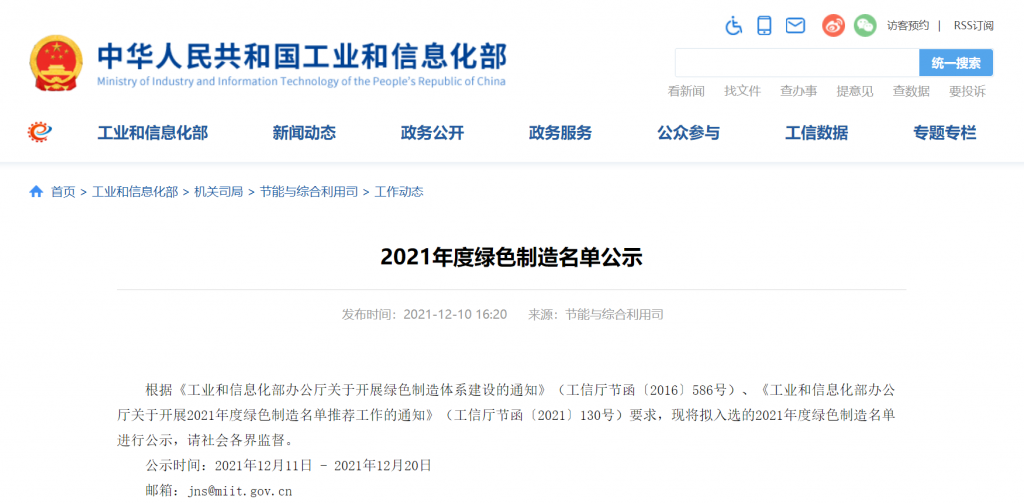 2021年12月10日国家工信部发布了“2021年度绿色制造名单公示”的通知,由中联认证实施第三方评价的4家企业获得公示,中车大连机车车辆有限公司、风神襄阳汽车有限公司、长飞光纤潜江有限公司获得国家级示范绿色工厂称号,东风商用车有限公司获得国家级示范绿色供应链企业的称号。