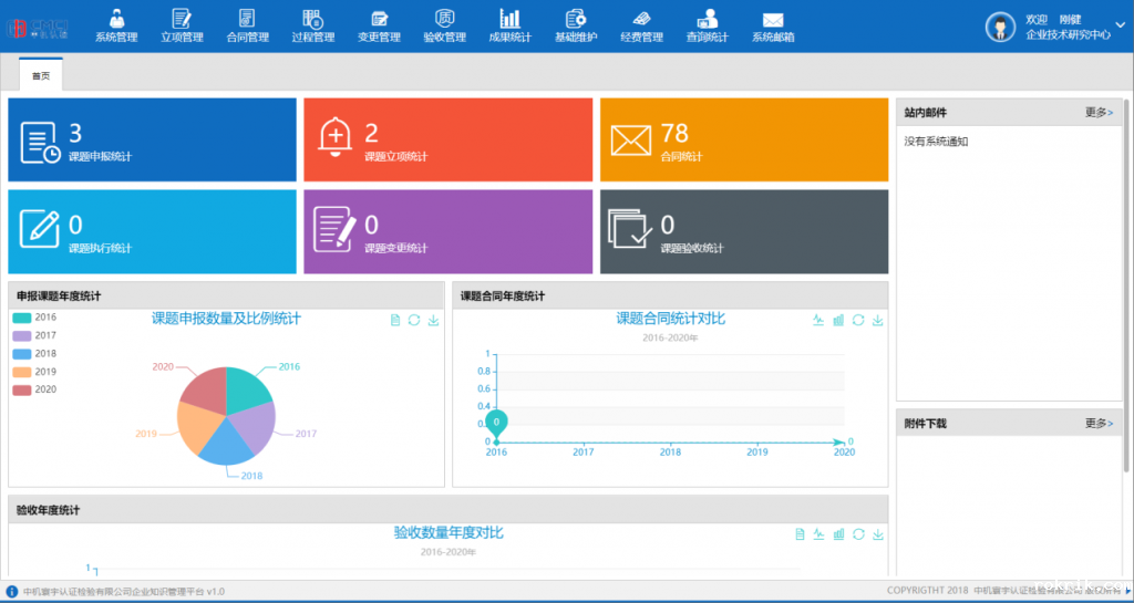 V1.0平台以“科技管理和科技知识服务”为主题,以科研项目全生命周期管理为主线,以统筹资源、优化流程、提高效率、降低成本、提升安全风险管理水平和科技服务质量为目标。系统实现了中机认检科研课题从申报到结题验收的全过程管理,包括课题立项、合同管理、课题实施、课题变更、课题验收,以及公司专利、软件著作权、论文、科技奖励、标准、著作、研究报告等科技成果的申报与统计管理等,覆盖科技管理的业务需求,优化科技管理,促进科技数据交流共享,增强科技管理决策支撑服务,一定程度上提高了科技管理的效率和效益。