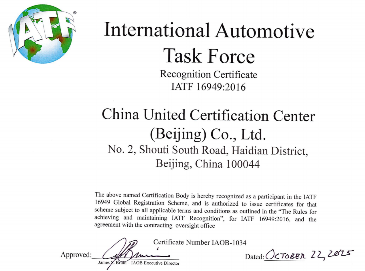 2025年10月22日,中联认证中心(北京)有限公司(简称“中联认证”)迎来重要里程碑——成功获得国际汽车工作组(IATF)颁发的IATF 16949:2016汽车行业质量管理体系认可证书,正式成为国际汽车监督署(IAOB)的签约认证机构(CB),标志着中联认证已具备开展IATF 16949:2016汽车行业质量管理体系认证的专业资质,为进军汽车行业认证服务领域迈出关键一步。