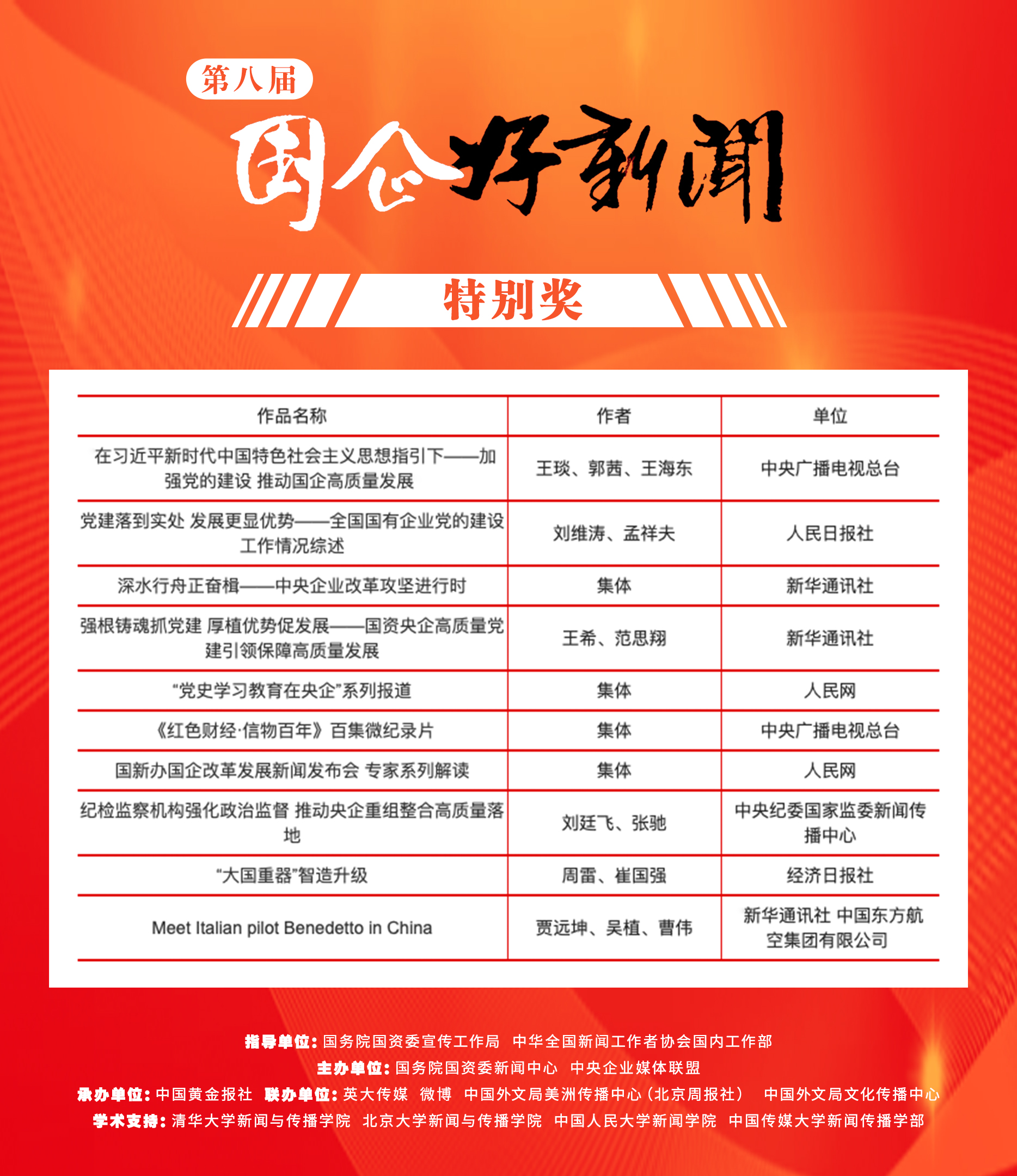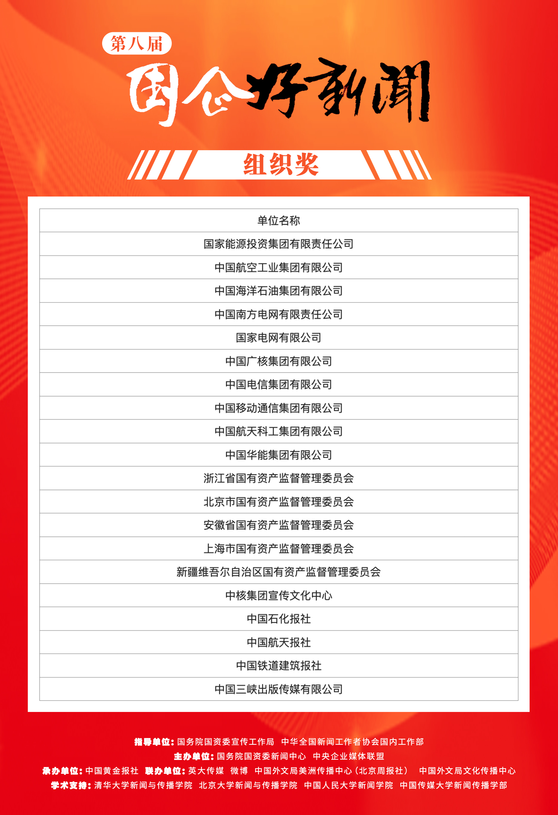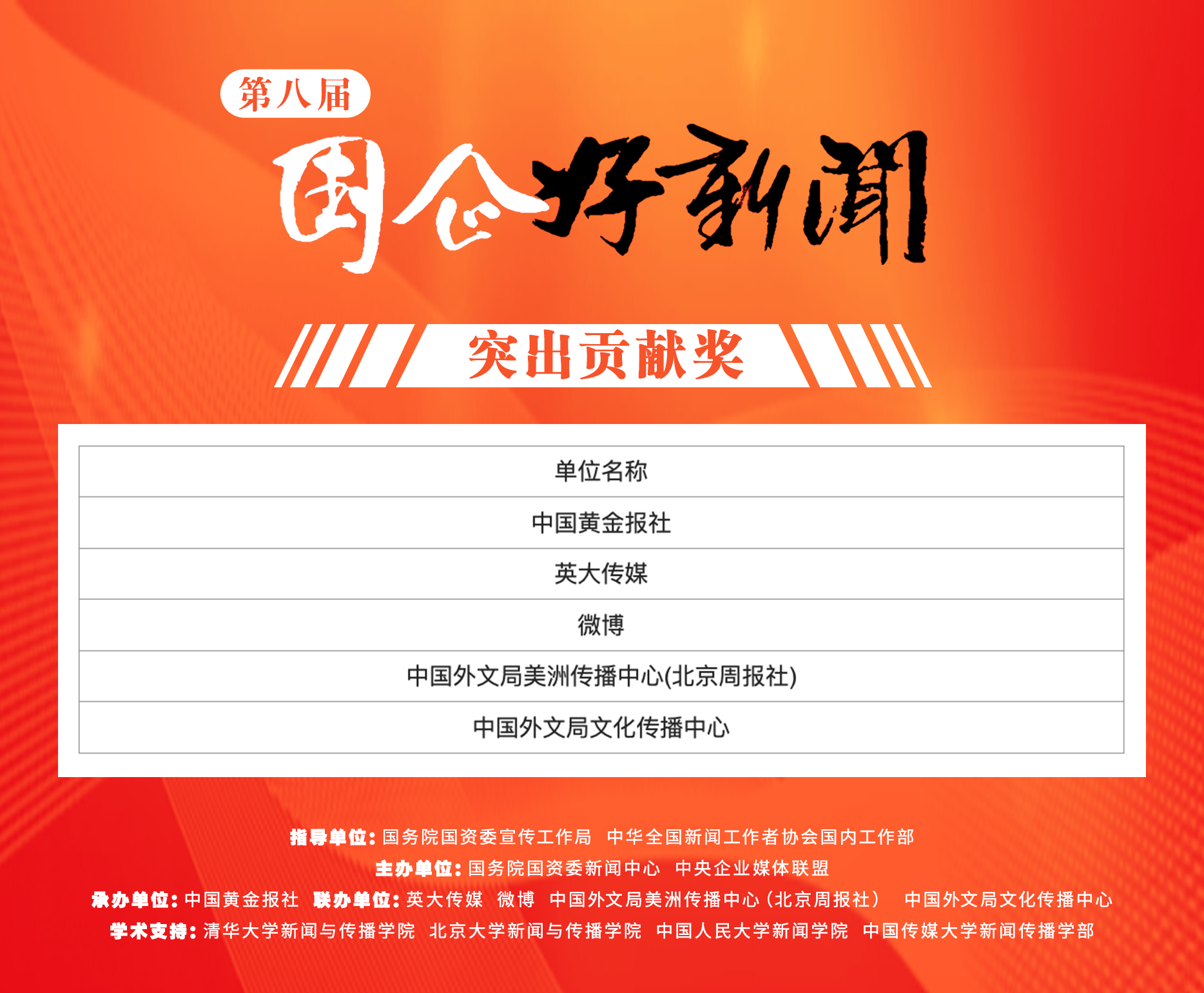 在国资委党委的高度重视下,第八届“国企好新闻”由国务院国资委宣传工作局、中华全国新闻工作者协会国内工作部指导,国务院国资委新闻中心、中央企业媒体联盟主办,中国黄金报社承办,英大传媒、微博、中国外文局美洲传播中心(北京周报社)、中国外文局文化传播中心联办,清华大学新闻与传播学院、北京大学新闻与传播学院、中国人民大学新闻学院、中国传媒大学新闻传播学部提供学术支持。征集、评选历时2个月,得到了国资国企、主流媒体、社会公众的广泛关注和积极参与,3772件新闻作品、73名新闻创客人选参评,138家国资国企单位报名,相比往届量质齐升,社会影响力显著增强。