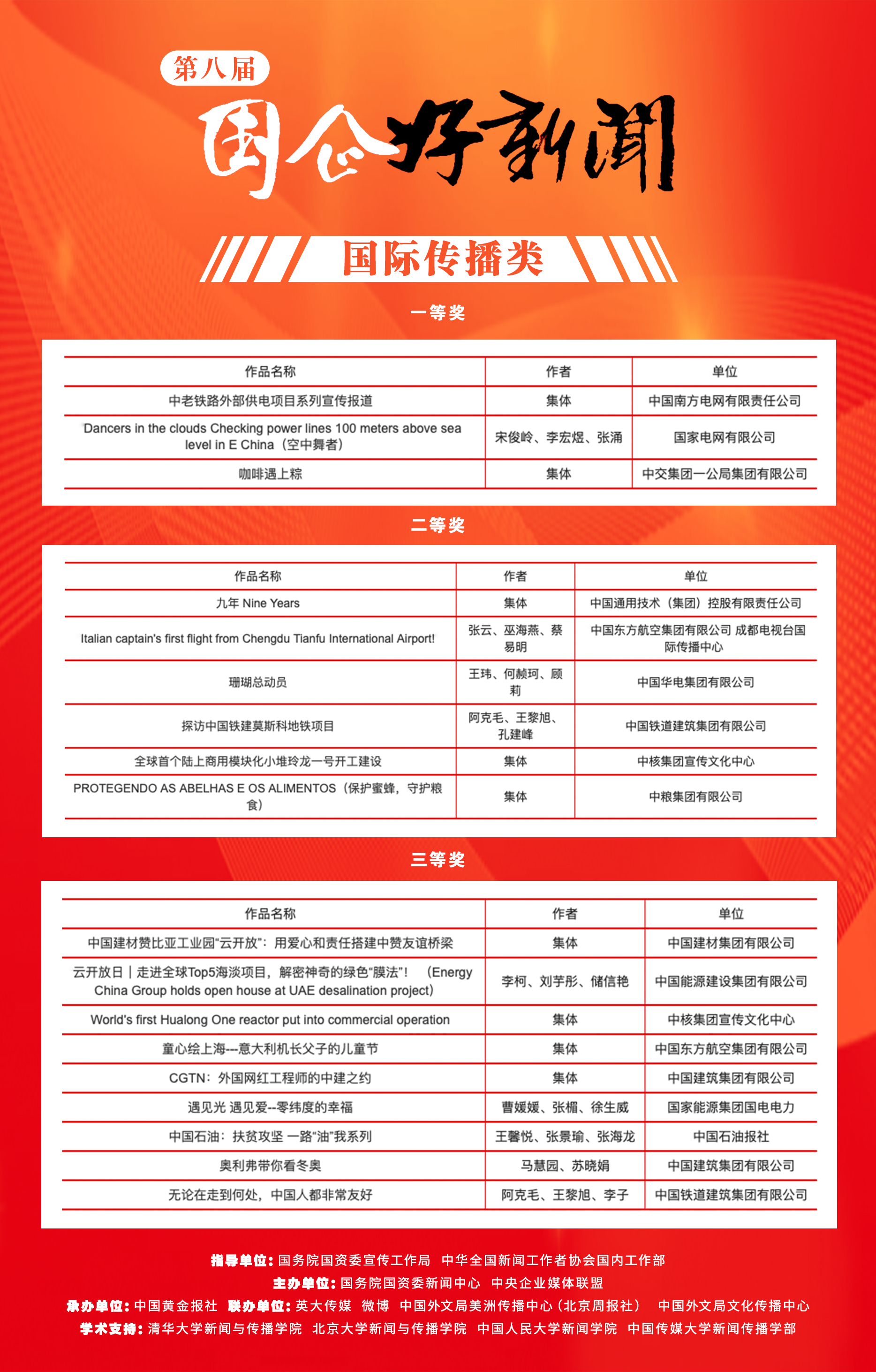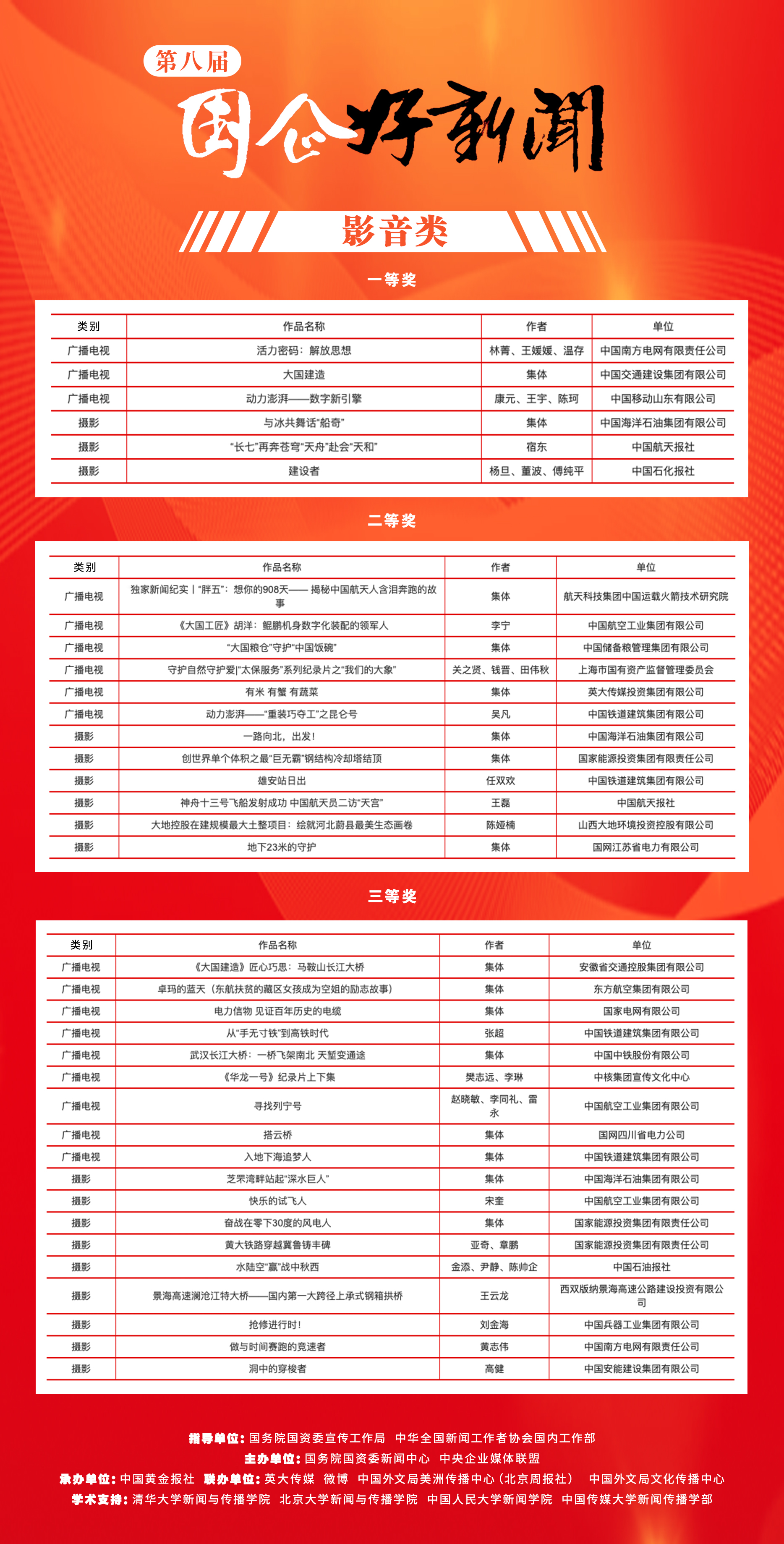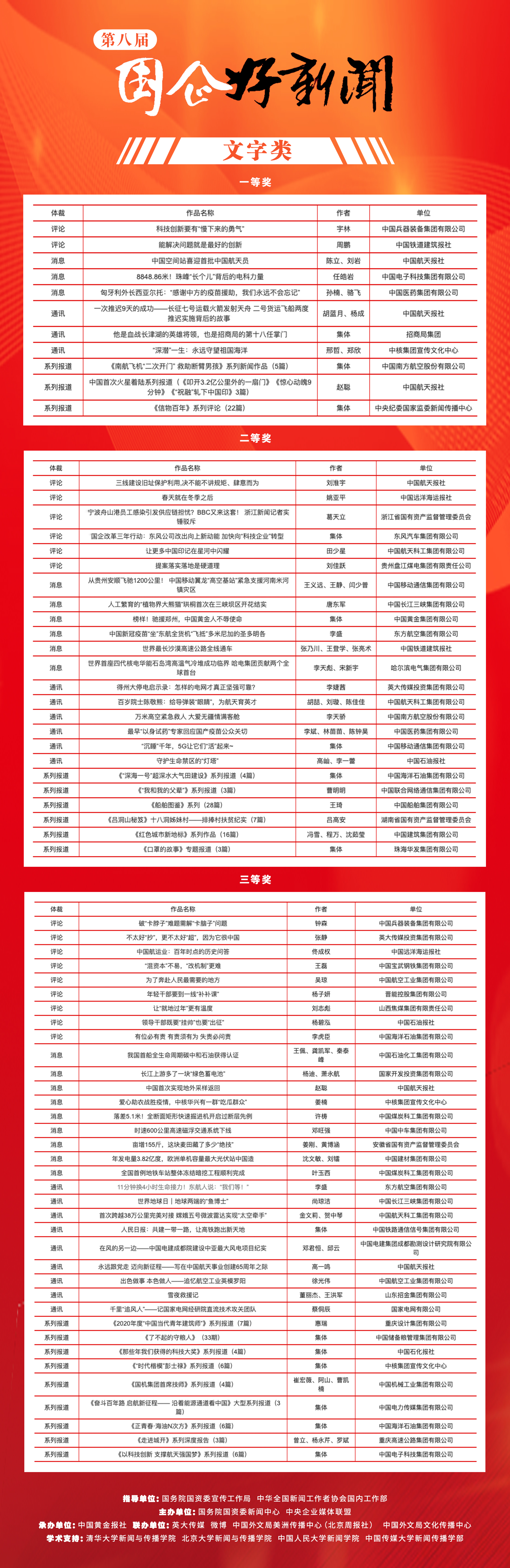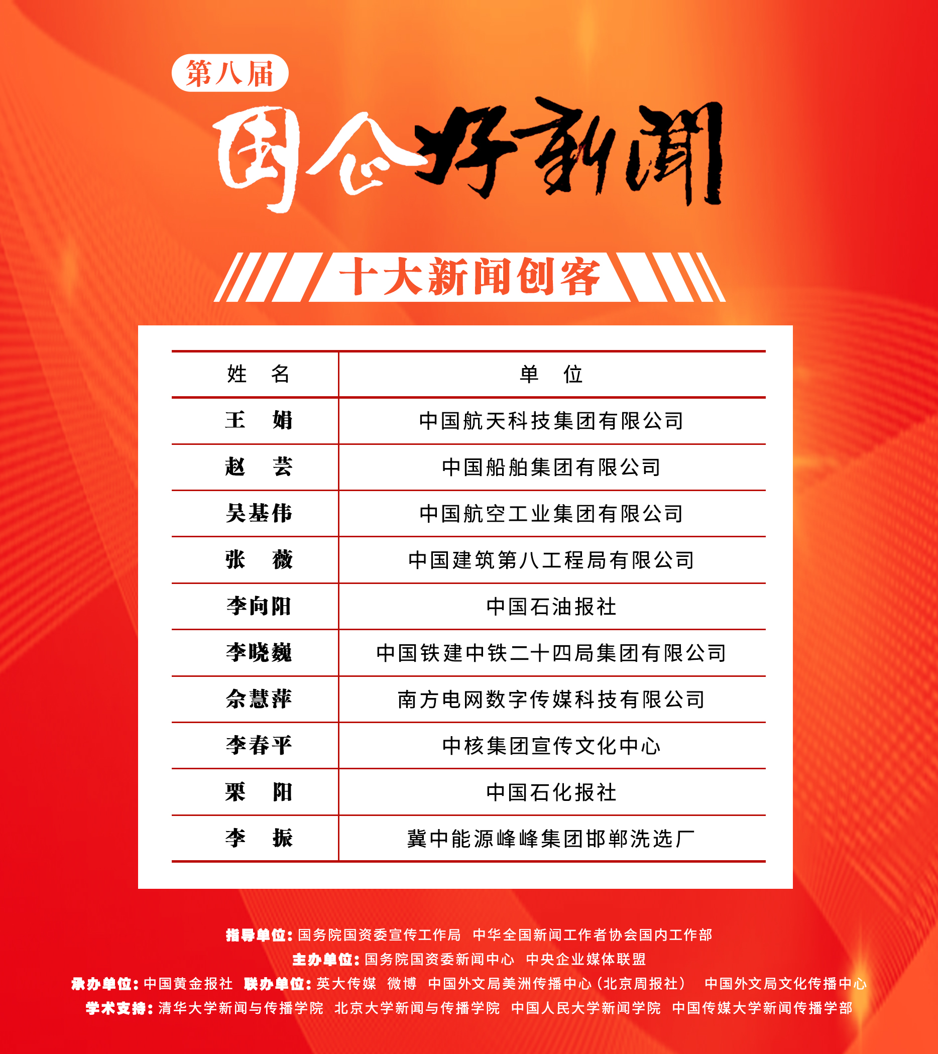1月11日,第八届“国企好新闻”推介历经单位推荐(自评)、专家复评、终评、公示等环节,3772件申报作品中,227件精品荣膺“国企好新闻”。其中,一等奖32件、二等奖66件、三等奖99件,优秀奖20件,专家评委会还给予主流媒体的10篇精品力作“特别奖”;20个单位获得组织奖,5个单位荣获突出贡献奖,10名新闻创客从73位申报者中脱颖而出,为国资国企宣传队伍和主流媒体搭建交流、对标平台,汇聚国资正能量、传播国企好声音。这些“国企好新闻”作品,生动地再现了极不平凡的2021年国企改革发展党建,清晰地勾勒了可亲可爱可敬的新国企形象。