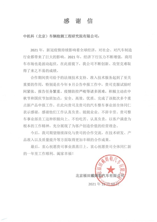 北京福田戴姆勒汽车有限公司发来感谢信,对中机认检中机检测汽车整车事业部在公告申报工作中克服困难,积极主动加班加点,高效优质完成任务表示感谢!