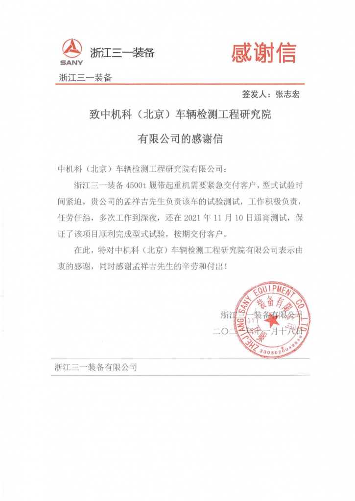 浙江三一装备有限公司发来感谢信,对中机检测特种设备事业部孟祥吉在时间紧迫的情况下,多次工作到深夜完成4500t履带起重机的型式试验致以最诚挚的感谢!
