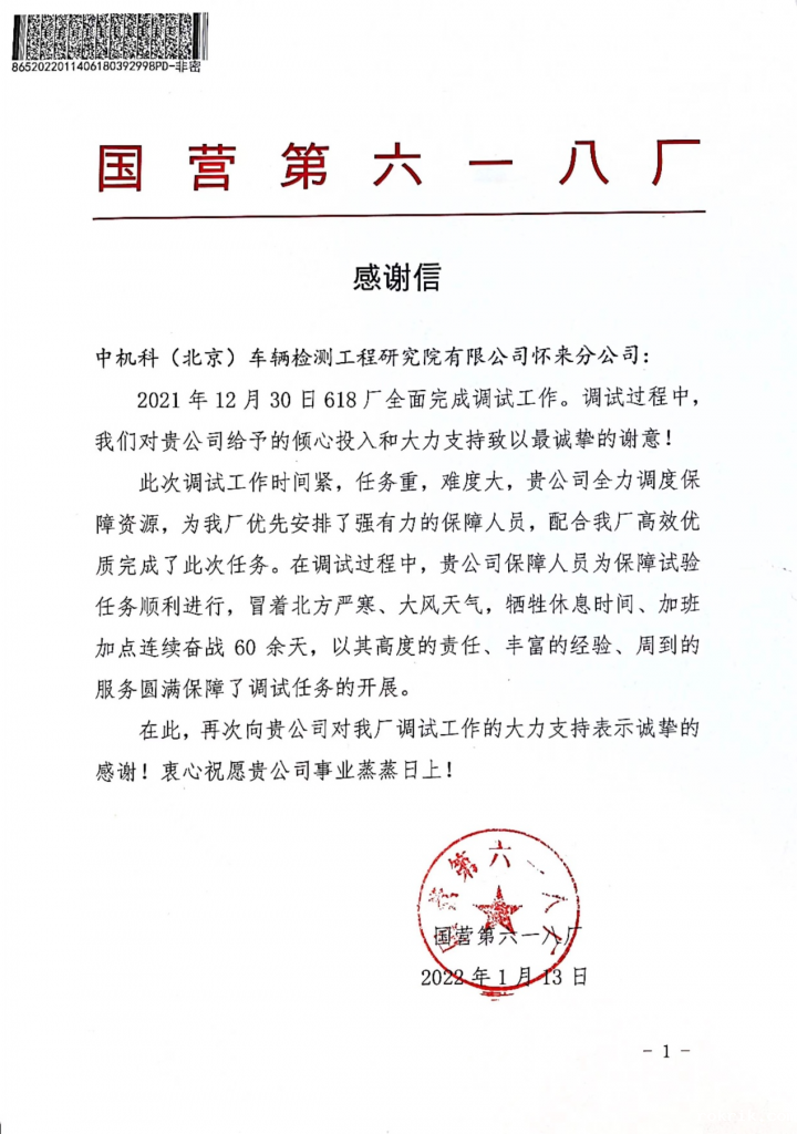 国营第六一八厂发来感谢信,对中机认检中机检测怀来分公司,在时间紧、任务重、难度大的情况下,连续奋战60余天,以高度的责任、丰富的经验、周到的服务圆满保障其调试任务的完成表示感谢。