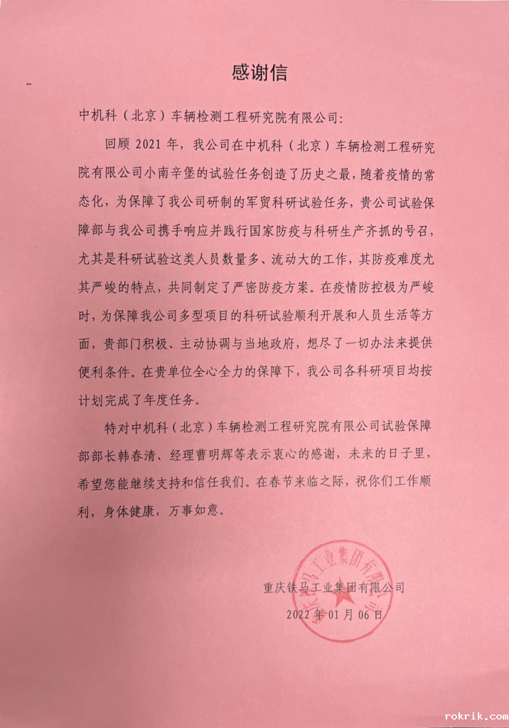 重庆铁马工业集团有限公司发来感谢信,对中机检测试验保障部韩春清、曹明辉在试验人员数量多、流动大、疫情防控严峻的情况下,积极配合,主动协调,保障其公司各科研项目按计划完成致以最诚挚的感谢!