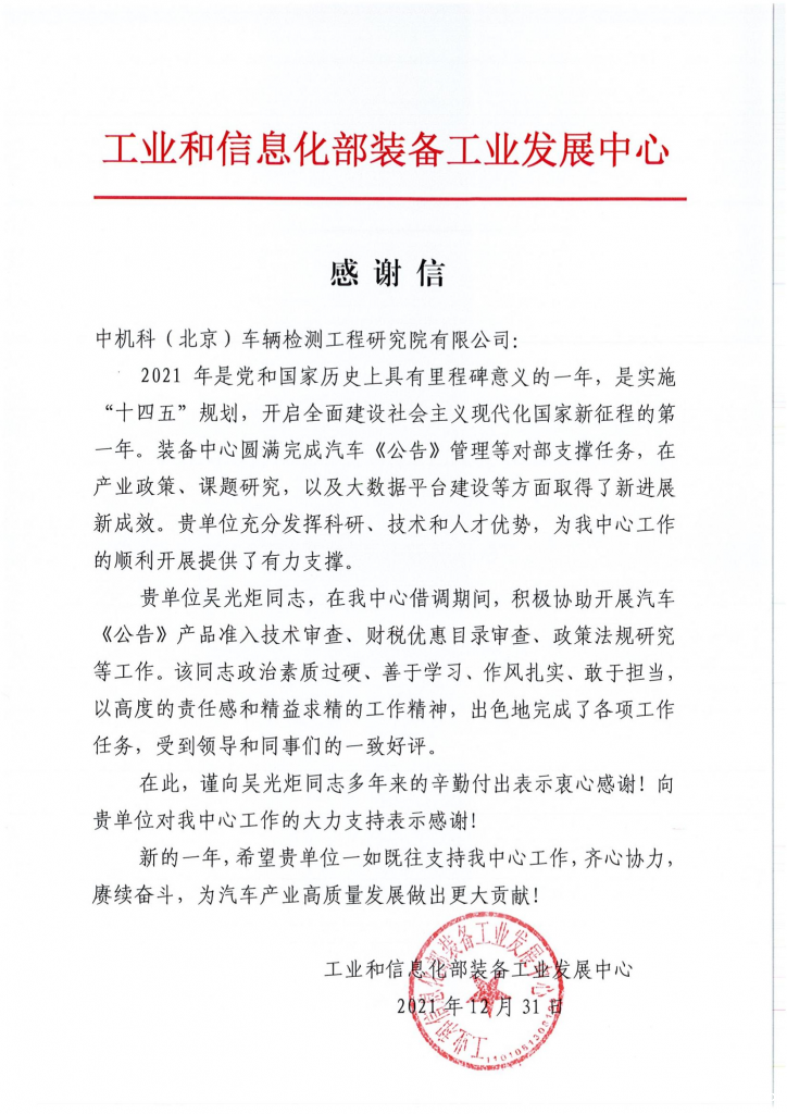 工业和信息化部装备工业发展中心发来感谢信,对中机认检中机检测借调专家吴光炬表示感谢。吴光炬在借调期间以作风扎实、敢于担当,以高度的责任感和精益求精的工作精神,积极协助开展汽车《公告》产品准入技术审查、财税优惠目录审查、政策法规研究等工作,出色地完成了各项工作任务,受到领导和同事们的一致好评。