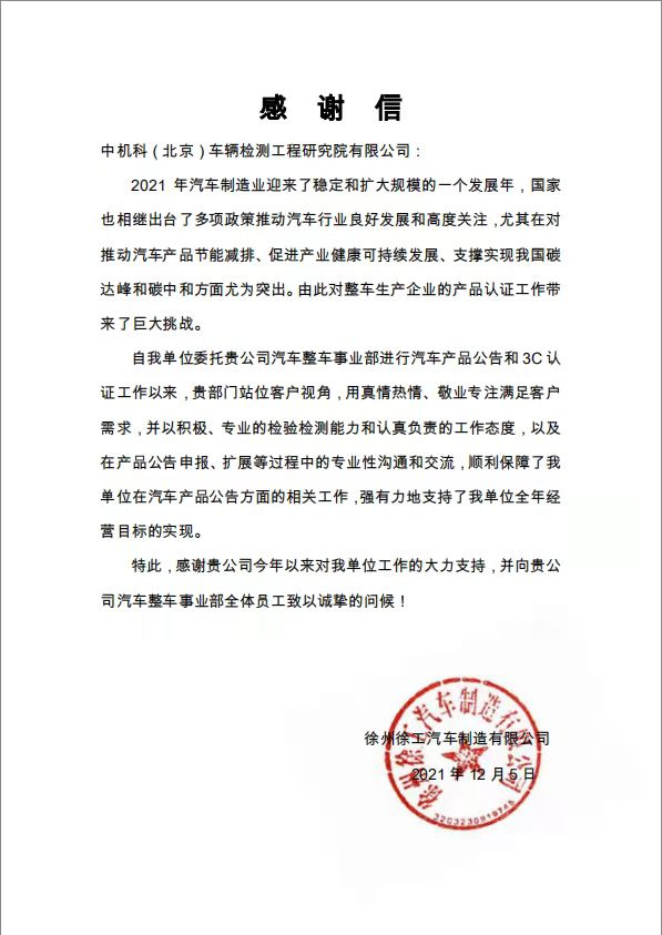 徐州徐工汽车制造有限公司发来感谢信,对中机认检中机检测汽车整车事业部用真情热情、敬业专注满足客户需求,以积极、专业的检验检测能力,认证负责的工作态度,专业的沟通和交流,保证汽车公告相关工作,支持全年营收目标的实现致以最诚挚的感谢!