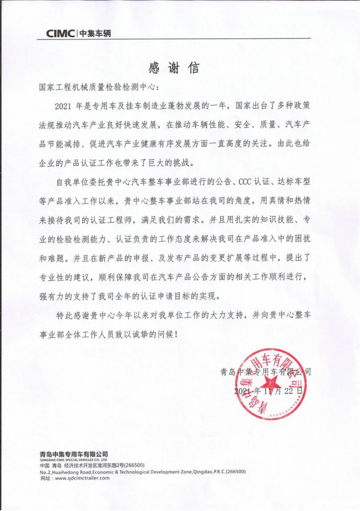 青岛中集专用车有限公司发来感谢信,对中机检测汽车整车事业部解决其在产品准入中的困扰和难题,并在新产品的申报、及发布产品的变更扩展等过程中提出专业性的建议,保障其在汽车产品公告方面的相关工作顺利进行,致以最诚挚的感谢!