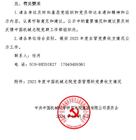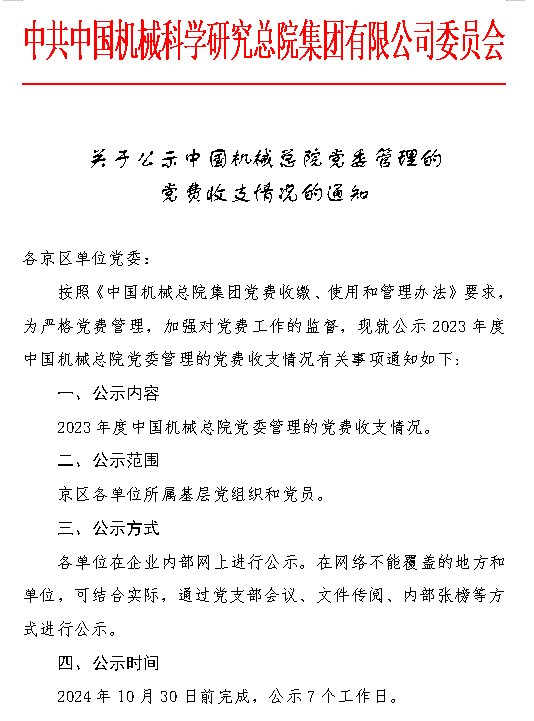 关于公示中国机械总院党委管理的 党费收支情况的通知