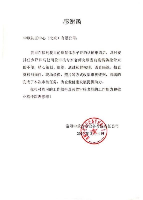 在中联认证实施远程审核战“疫”中,洛阳中重发电设备有限责任公司就是其中的一个战场。因发展需要,企业急需获取认证证书,于2月28日提出希望尽快审核的申请,市场部迅速协同项目部、审核部,一起精心策划针对其的远程审核工作,并于3月2日至4日成功开展了远程审核,助力企业的健康发展。中联认证的快速响应需求、高效安排审核,以及审核老师的专业能力和敬业态度,获得了企业的高度认可,特致感谢函表达对中联认证的感激和信任。