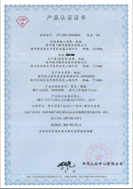 新冠肺炎在江城武汉爆发之初,国家一声令下,徐工集团332台起重、土方产品积极投入到雷神山、火神山医院搭建中,为实现“中国速度”提供了设备保障。为助力抗疫企业复工复产,促进工程机械行业正向发展,2020年03月29日,中汽认证中心有限公司(以下简称“中汽认证”)向徐州徐工随车起重机有限公司颁发了行业首张随车起重机产品CCAP标志认证证书。