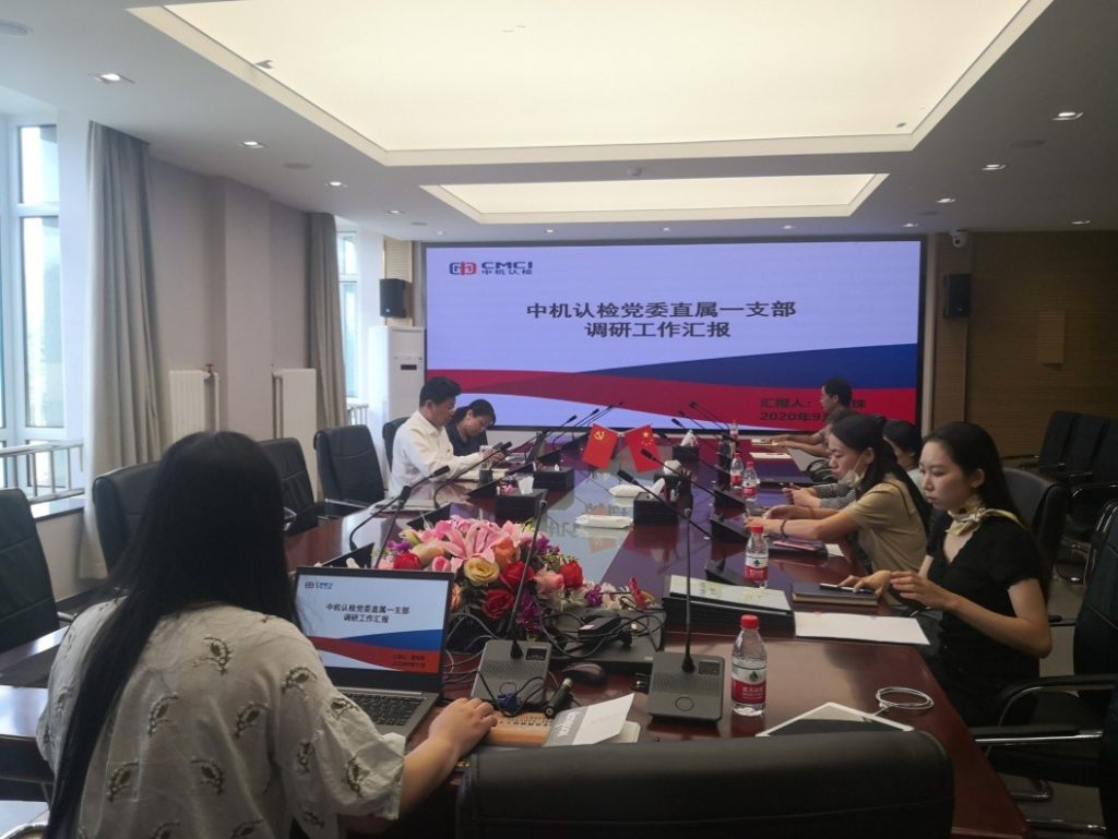 2020年9月11日下午,中机认检董事长、党委书记付志坚对中机认检党委直属一支部(以下简称“一支部”)进行调研。一支部召集人夏明珠对一支部的人员构成、筹建进度等情况进行了汇报,并将未来一支部工作的指导思想、工作思路、开展方式以及未来的工作和执行预案做了详细的阐述。