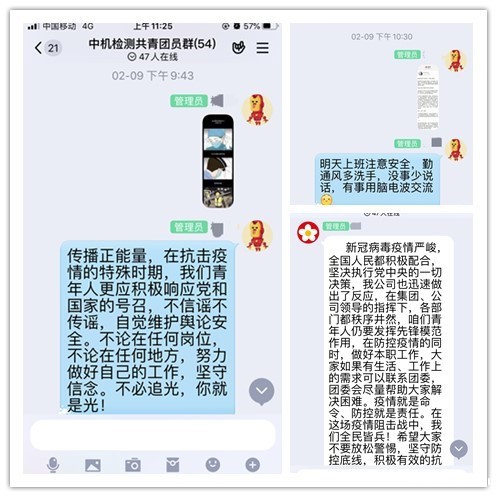 2月10日开始复工,很多外地返京的青年员工还需要遵循北京市的要求,居家隔离14天,为了缓解大家的负面情绪,中机检测团委利用空闲时间,通过多媒体等渠道,发送相关学习知识,鼓励相互交流,并定期向居家隔离的人员致电沟通。